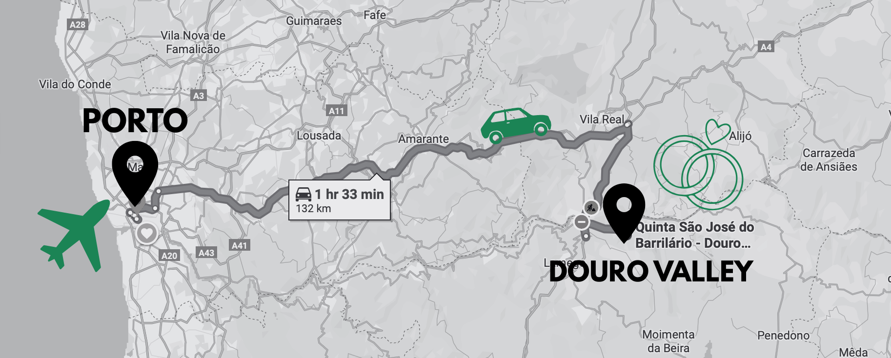 The wedding venue is located in the Douro valley, 1h30min drive from Porto city.